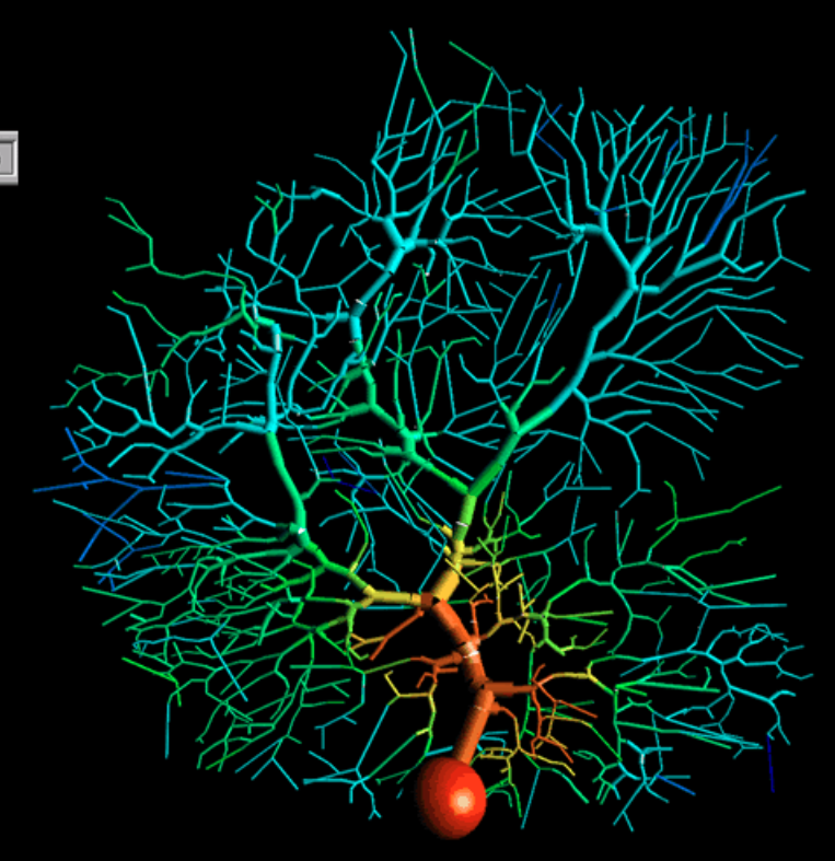 This is a capture of a detailed multi-compartmental model of a cerebellar Purkinje cell , created with GENESIS simulator. It shows an input spike coming into the dendritic tree and spreading out as it moves down to the soma (the orange ball). The output of the soma is through a single axon ( not shown).
