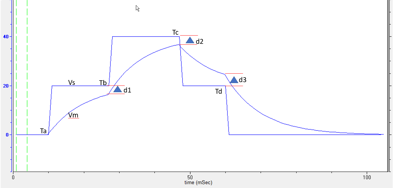 The curved line is the presented result of calculating the membrane voltage (Vm) over the 100 mSec step interval. Notice that the two-step functions are set to an amplitude of 20 mV, with one much smaller in width than the other.