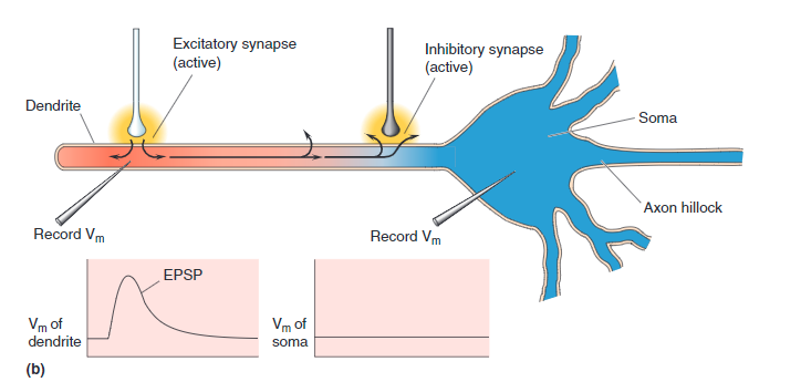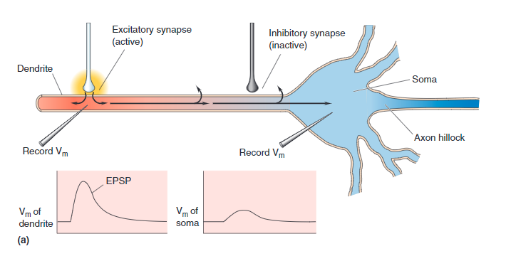• EPSP, Green - If the connected ion channel stimulates the soma, it is called Excitatory Post-Synaptic Potential